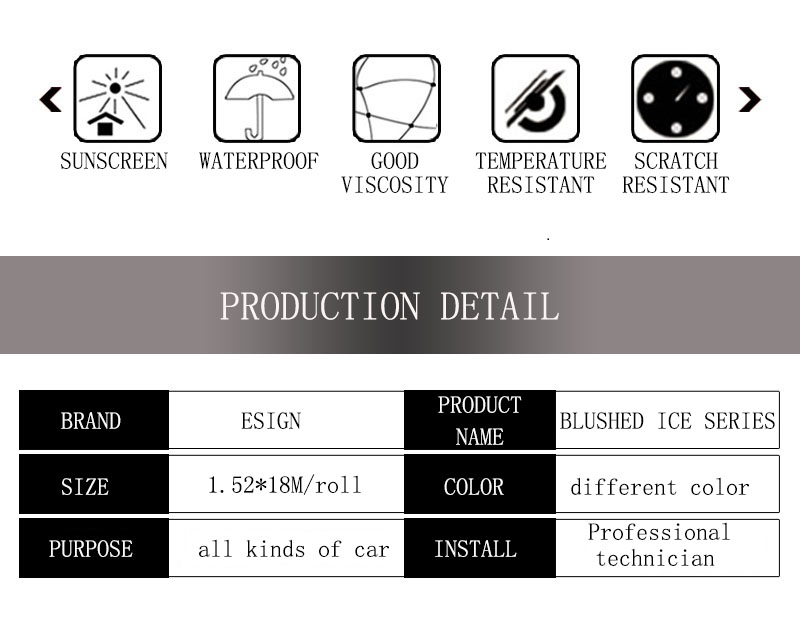 ESIGN's car wrap products are made of high polymer PVC material. The glue is compounded with European Rosh. The car wrap is equipped with high-density air guide grooves, which has good air conduction effect, easy construction, strong adhesion, and no residual glue when removed. Damage to car paint, dry paste construction without blistering, up to 3-5 times ductility, stretch and do not change color and no break, high and low temperature resistance, UV resistance, acid rain resistance, all-round tight fit the whole car, no cracking, no warping The side is like the original paint effect, without hurting the original car paint, you can change the color of the car body and paint or paint as you like. Color matching is more autonomous, and there will be no trouble of color difference in different parts of the same color. If you want to restore the original paint, just remove the film.